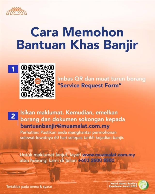 KUALA LUMPUR, 24 Oktober 2025 – Prihatin terhadap situasi terkini melibatkan bencana banjir yang melanda di sesetengah kawasan di negeri Perak, Bank Muamalat Malaysia Berhad (Bank Muamalat) mengumumkan penawaran bantuan khas banjir yang merangkumi bantuan moratorium untuk semua pembiayaan individu dan perniagaan sehingga enam bulan serta penggantian kad debit dan kad kredit tanpa sebarang bayaran kepada pelanggannya yang terjejas.