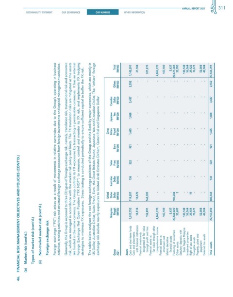 Market risk (cont’d.) Types of market risk (cont’d.) Non-traded market risk (cont’d.) foreign exchange risk Group 2021 assets Cash and short-term funds Cash and placements with financial institutions Financial investments designated at fair value through profit and loss Financial assets at fair value through other comprehensive income Financial assets at amortised cost Islamic derivative financial assets Financing of customers