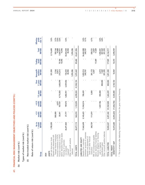 Market risk (cont’d.) Types of market risk (cont’d.) Non-traded market risk (cont’d.) Rate of return risk (cont’d.) Group 2024 ASSETS Cash and short-term funds Deposits and placements with licensed financial institutions Financial investments at FVTPL Financial investments at FVOCI Islamic derivative financial assets Financing of customers: - non-impaired - impaired* Other non-profit sensitive balances TOTAL ASSETS LIABILITIES AND