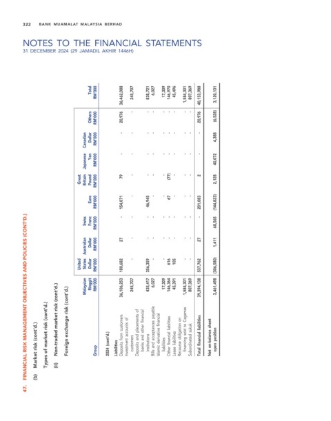 Market risk (cont’d.) Types of market risk (cont’d.) Non-traded market risk (cont’d.) Foreign exchange risk (cont’d.) Group 2024 (cont’d.) Liabilities Deposits from customers Investment accounts of customers Deposits and placements of banks and other financial institutions Bills and acceptances payable Islamic derivative financial liabilities Other financial liabilities Lease liabilities Recourse obligation on financing
