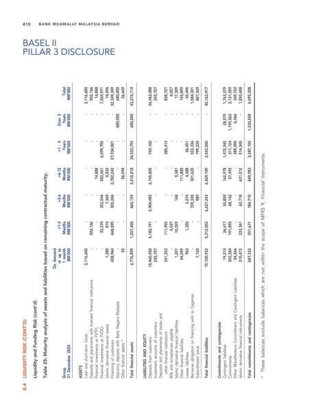 LIQUIDITY RISK (CONT’D) Liquidity and Funding Risk (cont’d) 31 December 2024 Cash and short-term funds Deposits and placements with licensed financial institutions Financial investments at FVTPL Financial investments at FVOCI Islamic derivative financial assets Financing of customers Statutory deposits with Bank Negara Malaysia Other financial assets * Total financial assets LIABILITIES AND EQUITY Deposits from customers Investment accounts of custome