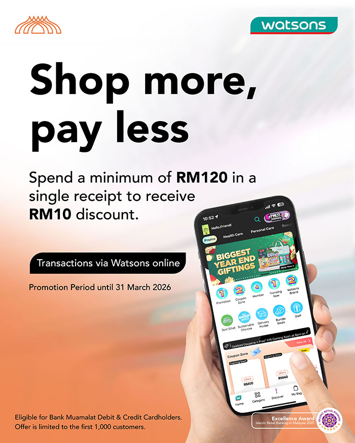 Shop at Watsons Online & Save! Get RM10 OFF with a minimum spend of RM120 when you pay using your Debit or Credit Card-i.